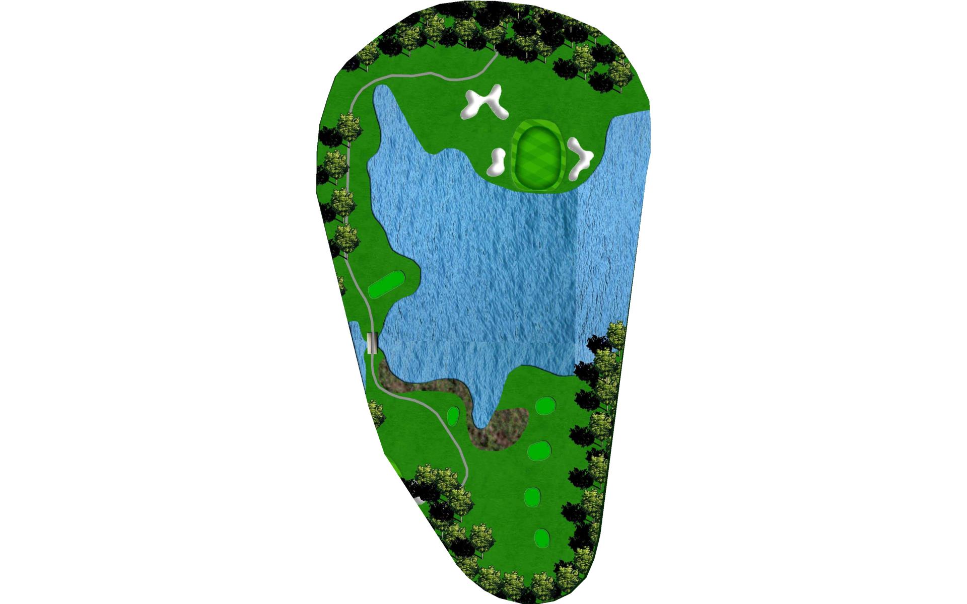 Downhill straight over water. DO NOT LEAVE IT SHORT. A midiron into this par 3 is the ideal shot. The green is wide and long, so give yourself plenty of room.
